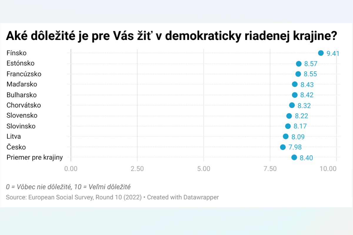 20. apríla 2023Podľa najnovších dát Európskej sociálnej sondy (ďalej len ESS) je pre 88 percent obyvateľov Slovenska dôležité žiť v krajine, ktorá je demokraticky riadená. Svedčí o tom priemerná hodnota odpovedí pre krajinu na otázku Aké dôležité je pre Vás žiť v demokraticky riadenej krajine, ktorá sa pohybuje tesne pod priemerom desiatich zúčastnených krajín1