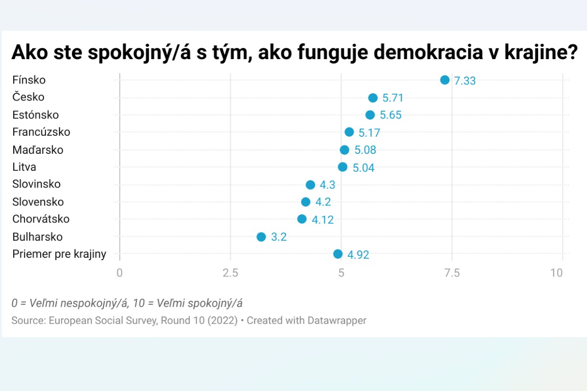 Štatisticky vyššiu dôležitosť demokracie, v porovnaní so Slovákmi, vyjadrili Fíni, Estónci a Francúzi, naopak, pre českých respondentov je to menej dôležité. Odpovede Slovákov na otázku„Do akej miery ste spokojný/á s tým, ako funguje demokracia v krajine? sú však o čosi viac negatívne. Slováci sa totiž umiestnili na treťom mieste od konca rebríčka, pred Bulharmi a Chorvátmi (graf 2).