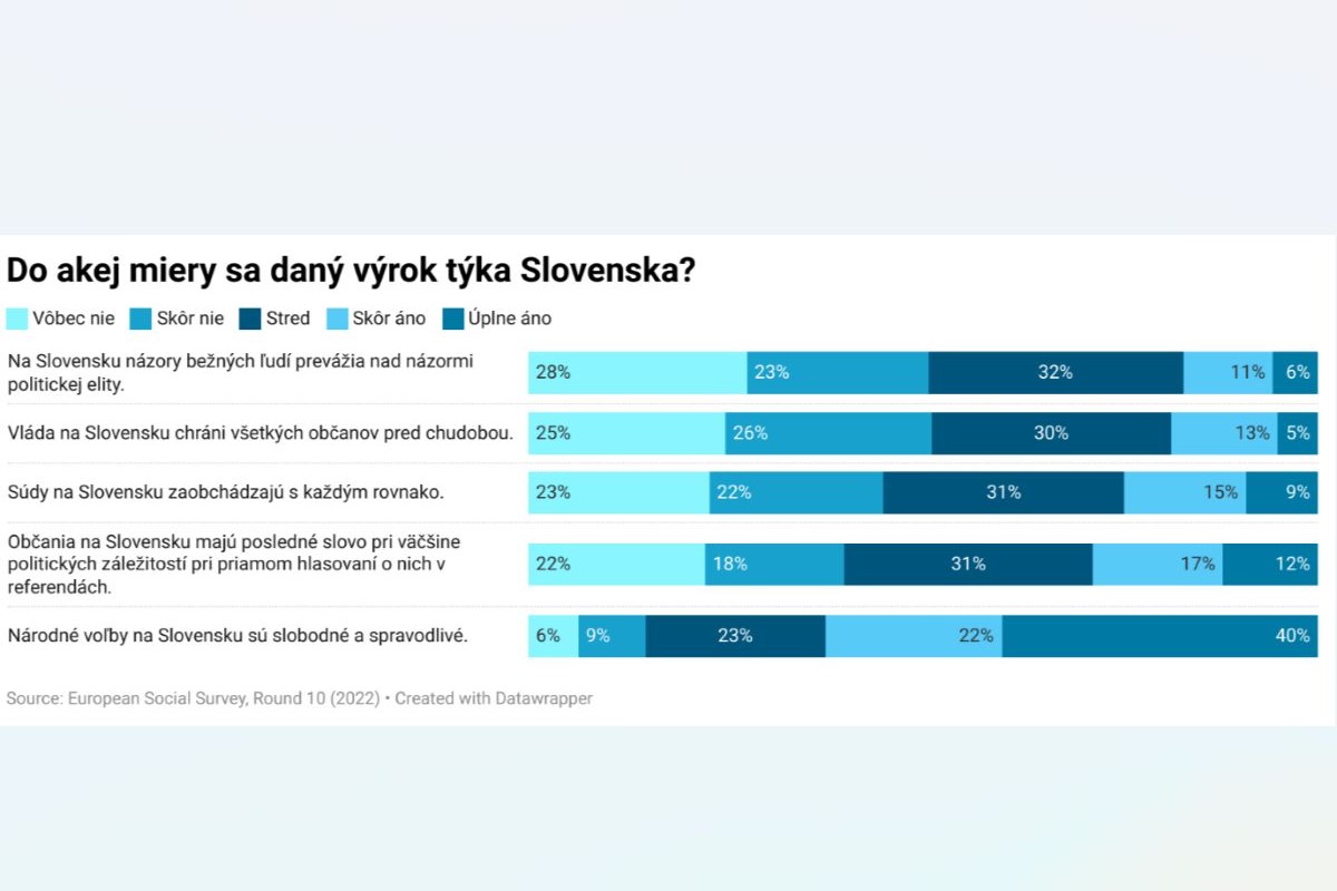 Podľa takmer tretiny Slovákov a Sloveniek (30,7 %) sú najdôležitejšie pre demokraciu slobodné a spravodlivé voľby, pričom takýto výrok zároveň hodnotili ako týkajúci sa Slovenska (graf 3); 21,8 percenta respondentov si zvolilo ako najdôležitejšie pre demokraciu aby „občania mali pri najdôležitejších politických záležitostiach posledné slovo, a to prostredníctvom hlasovania o nich v referendách“. Rovnako, takmer 17 percent respondentov považuje za najdôležitejšie pre demokraciu, aby „vláda chránila všetkých občanov pred chudobou“ a aby „názory bežných ľudí prevažovali nad názormi politickej elity“. Najnižšie percento (14,2 %) respondentov si zvolilo možnosť, aby „súdy zaobchádzali s každým rovnako“. Uvedené tvrdenia sa podľa respondentov skôr netýkajú Slovenska, pričom s výrokom: „Na Slovensku názory bežných ľudí prevážia nad názormi politickej elity“ nesúhlasilo najvyššie percento respondentov (28 %) (graf 3).
